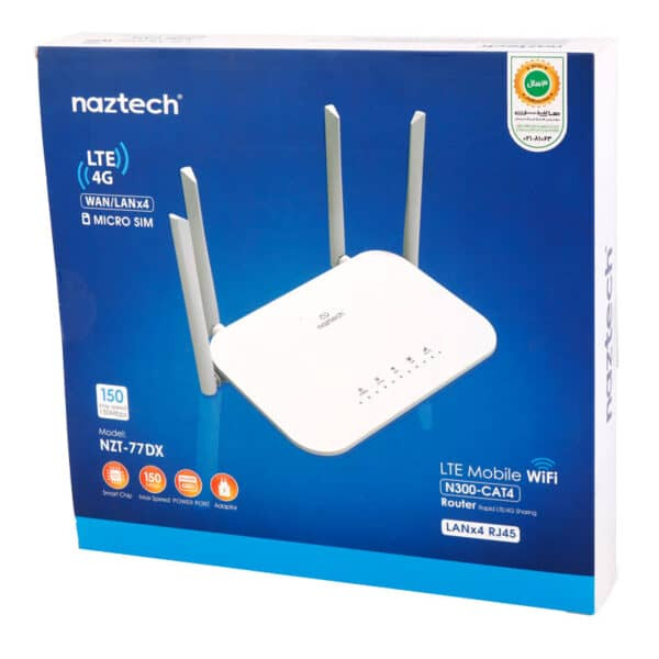 روتر بیسیم 4G/LTE نزتک مدل DX77 محصولی از شرکت نزتک است.این روتر شرکت نزتک دارای یک درگاه برای نصب سیمکارت است که میتوانید از سیمکارت تمام اپراتور ها استفاده کنید.در کنار شیار سیمکارت،چهار درگاه LAN وجود دارد که میتوان از ان برای اتصال با سیم ابزار ها به شبکه بیسیم استفاده کرد.همچنین این دستگاه میتواند از طریق اتصال WAN به اینترنت فعلی شما وصل شود.این انصال میتواند شامل یک اینترنت پهن باند باشد که به وسیله انتن های پوینت تو پوینت (P2P) وایرلس دریافت میکنید یا همان اتصال (ADSL) خانگی تان که مدت ها از ان استفاده کرده اید.برای این دستگاه چهار عدد انتن در نظر گرفته شده است که دو تای ان برای اتصال انتن های 3G/4G است و دو تای دیگر برای انتن های شبکه وای فای است.در قسمت پشت روتر Naztech DX77 کلید های WPS و Resetو کلید روشن و خاموش قرار گرفته است.