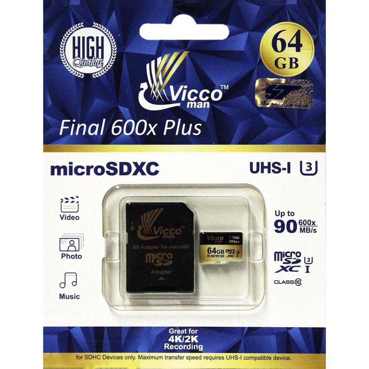 احتمالا نیاز به حافظهای که در کنار استفادهی ساده و امکان نقلوانتقال بیدردسر، سرعت مناسبی هم داشته باشد، دلیل بهوجودآمدن micro SDها بوده است. نسلهای قبلی این حافظه که به mini SDها معروف بودند، دیگر وجود ندارد. این روزها تنها از SD کارتها آن هم فقط در دوربینهای دیجیتال حرفهای استفاده میشود. میکرو SDها که گاهی اوقات و در بعضی از دستگاهها با نام «ترانس فلش» (TransFlash) یا TF شناخته هم میشوند، از سال 2005، خودی نشان دادند و بهسرعت جای خود را در دل دستگاههای دیجیتال باز کردند. طوری که تنها با گذشت یک سال از حضورشان، ظرفیت چهارگیگابایتی آنها روانهی بازار شد و بعدازآن هم سرعتها و ظرفیتهای متفاوت که همه نشاندهندهی محبوبیت بیشازحد این سری حافظهها هستند، روانهی بازار شدند. کارت حافظه میکرو اس دی ViccoMan Final 600x Plus UHS-l U3 با طراحی زیبا و طرحی تشکیل شده از رنگ مشکی و طلایی بوده و دارای استاندارد U3 نیز است. این کارت حافظه توانایی انتقال اطلاعات تا حداکثر سرعت 90 مگابایت بر ثانیه را دارد و برای ضبط ویدئو با کیفیت Full HD و 4Kو 2K بسیاری موارد دیگر مناسب است. عملکرد این کارت حافظه در دماهای بین منفی 25 تا 85 درجه سانتیگراد است.کارت حافظه ViccoMan Final 600x Plus قابلیت ها و امکانات متعددی از جمله ساخته شده بر پایه تکنولوژی MLC، داربودن استانداردهای FCC, CE, BSMI, VCCI و مقاوم در برابر نفوذ آب و ضربه است.