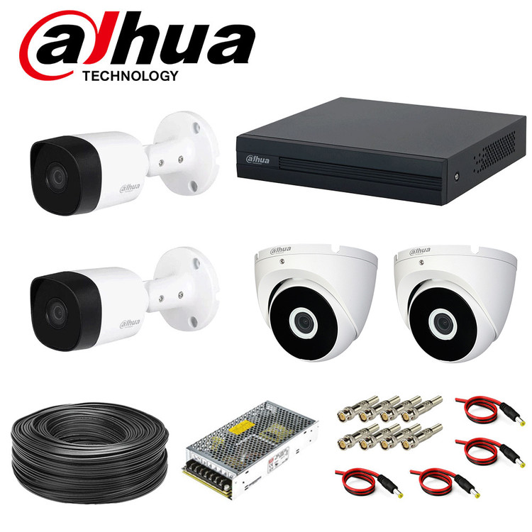 پکیج 4 دوربین داهوا فوق شامل2 عدد دوربین سقفی فلزی مدل DH-HAC-T2A21Pو 2 عدد دوربین بالت دیواری فلزی مدل HAC-B2A21P دوربین ها دارای زاویه دید 106درجه و دید در شب بوده و تا 40متر مربع را در شب پوشش میدهد . یک عدد دستگاه 4 کانال داهوا مدل XVR-1B04 که قابلیت اتصال 4 عدد دوربین HD و 1 عدد دوربین شبکه (IP CAMERA) را دارد. و ساپورت دوربین و ضبط تا کیفیت 2 مگاپیکسل را دارد و علاوه بر ساپورت دوربین های سی وی آر قابلیت اتصال دوربین انالوگ، TVI ،CVI ،AHD را نیز دارد. این دستگاه دارای یک عدد ورودی صدا و یک عدد خروجی صدا، خروجی HDMI ،VGA و AV ، فرمت ضبط H264، قابلیت ضبط حساس به حرکت، پشتیبانی از سرویس انتقال تصویر P2P نیز میباشد