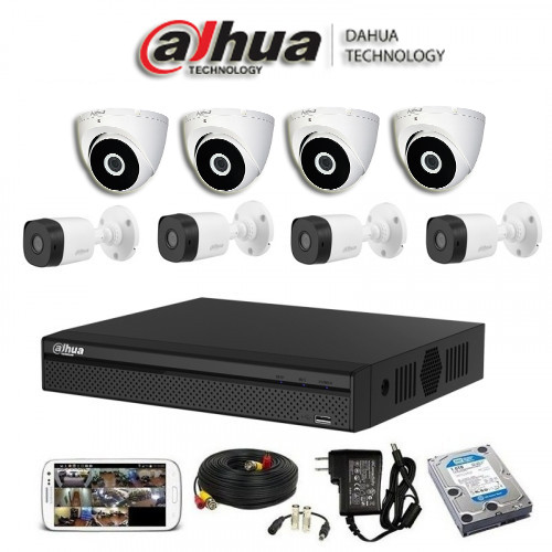 پکیج 8 دوربین داهوا فوق شامل4 عدد دوربین سقفی فلزی مدل DH-HAC-T2A21Pو 4 عدد دوربین بالت دیواری فلزی مدل HAC-B2A21P دوربین ها دارای زاویه دید 106درجه و دید در شب بوده و تا 40متر مربع را در شب پوشش میدهد . یک عدد دستگاه 8 کانال داهوا مدل XVR-1B08 که قابلیت اتصال 8 عدد دوربین HD و 2 عدد دوربین شبکه (IP CAMERA) را دارد. و ساپورت دوربین و ضبط تا کیفیت 2 مگاپیکسل را دارد و علاوه بر ساپورت دوربین های سی وی آر قابلیت اتصال دوربین انالوگ، TVI ،CVI ،AHD را نیز دارد. این دستگاه دارای یک عدد ورودی صدا و یک عدد خروجی صدا، خروجی HDMI ،VGA و AV ، فرمت ضبط H264، قابلیت ضبط حساس به حرکت، پشتیبانی از سرویس انتقال تصویر P2P نیز میباشد